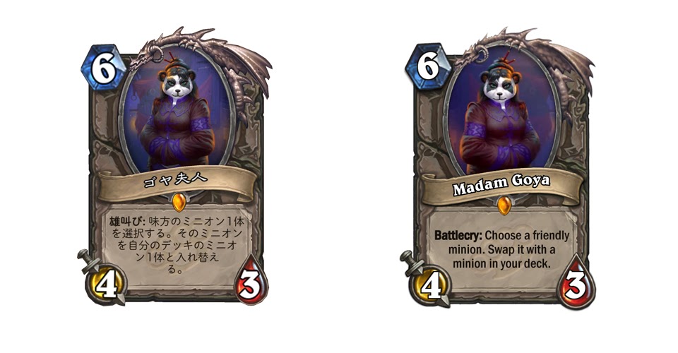 新カードの明らかに異なる点はボード上の選択したミニオンを手札ではなくデッキへ戻すこと、そしてデッキの中のミニオンと入れ替えることです。例えば《デスウィング / Deathwing》をデメリット無しでボードに置く可能性もありますが、多分にRNGに依存します。《バーンズ / Barnes》と比較すると、《ゴヤ夫人 / Madam Goya》が入れ替えるミニオンはデッキの中に眠っている本体であり、そのままのスタッツで出現するというメリットがあります。デメリットは貴重な雄叫び/Battlecryアビリティを持つミニオンが無為に消費されてしまう懸念があることでしょう。