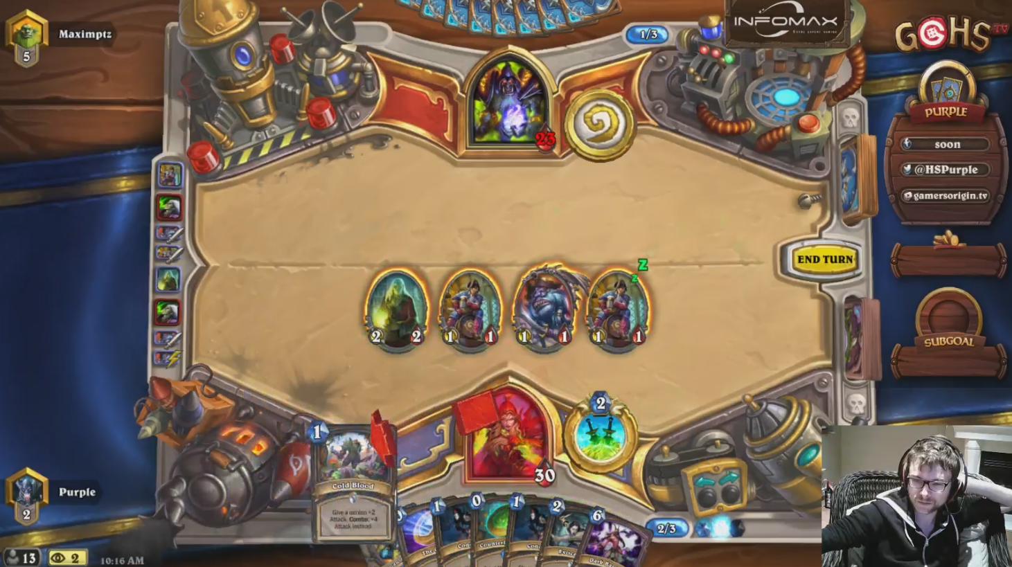 ここでPurpleとEloiseは《ガジェッツァンの競売人 / Gadgetzan Auctioneer》のドローという将来的な可能性を捨て、ヘルス2のミニオンに《冷血 / Cold Blood》を乗せて追加4ダメージと次のターン以降にも継続する脅威を盤面に作り出します。もしAoEが無ければここでゲームがおわり、AoEがあるなら除去されるのは仕方ないとしても、《シャドウボルト / Shadow Bolt》での対処を潰すために《闇の売人 / Dark Peddler》で引き当てた《隠蔽 / Conceal》1枚を消費します。